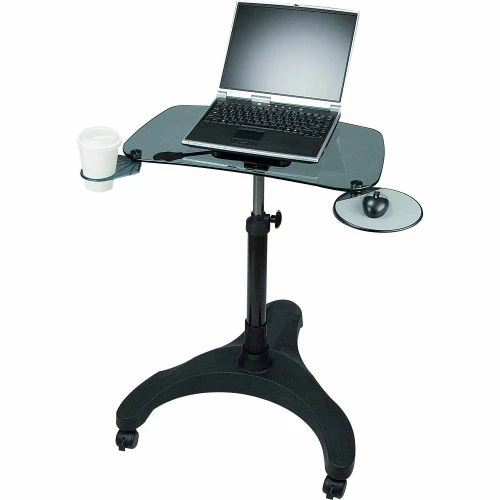Sit/Stand Mobile Laptop Workstation with Gas Cylinder Pole, Tempered Safety Glass Top in Smoke Finish.