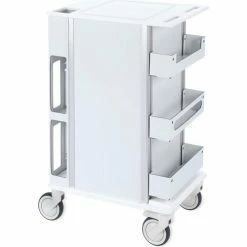Rolling Storage Cart with 5″ Casters: Versatile: Use as a Phlebotomy, IV, Vaccination, Refreshment, Craft Organization Cart and more. Lightweight with easy and comfortable maneuvering. Large work surface with integrated. Industry-recognized 5″ locking casters for quality and durability. Maximum storage variety and capacity with built in rail system for adding accessories. White Powder-Coated Aluminum Composite Material (ACM), High Density Polyethylene, and Polycarbonate. Made in the USA.