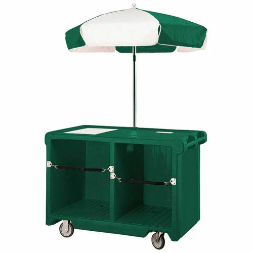 This Green Camcruiser® Vending Carts add revenue opportunities away from the kitchen/cafeteria and reduce wait times with extra food stations. Extremely durable polyethylene will not crack, dent, bubble, chip or break. Easy to clean. Brightly colored umbrella offers protection and creates high visability. Large Storage areas minimize restocking. Insulated food storage compartments maintain safe hot or cold temperatures for hours. The 55 in wide cart features two large storage areas underneth, a large full tray counter well and a 4″ x 6-3/4″ opening for electric or soda lines, cover included. Cart ships with Umbrella and cutting board included.