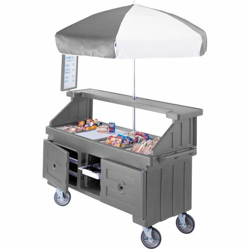 This Granite Gray Camcruiser® Vending Carts add revenue opportunities away from the kitchen/cafeteria and reduce wait times with extra food stations. Extremely durable polyethylene will not crack, dent, bubble, chip or break. Easy to clean. Brightly colored umbrella offers protection and creates high visability. Large Storage areas minimize restocking. Insulated food storage compartments maintain safe hot or cold temperatures for hours. This model comes with 4 tray wells that hold a full tray. Cash Drawer, Menue Board and Umbrella ships with unit.