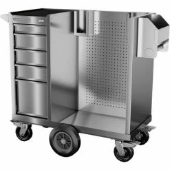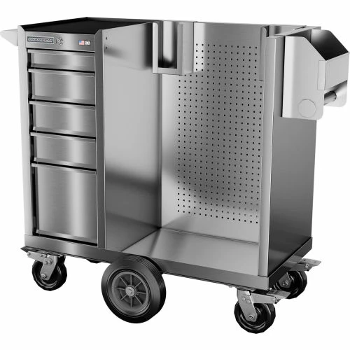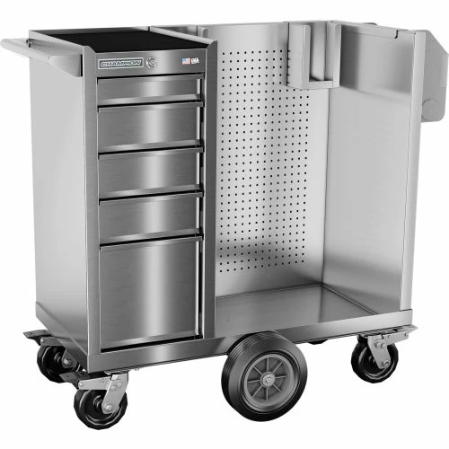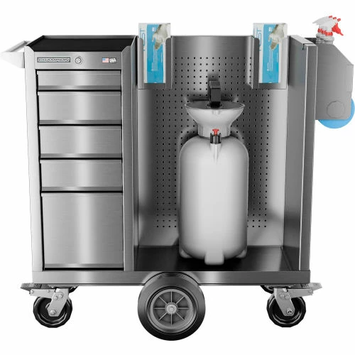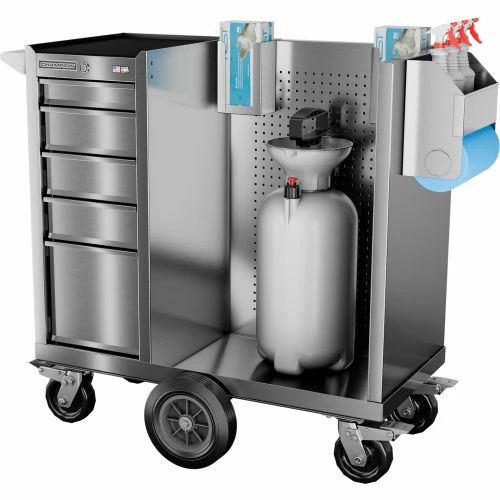 Designed to handle all of your sanitization needs in an industrial and commercial setting both indoors and outdoors. These units are made to handle demanding environments and are built to last. With the Maintenance Cart base, traveling distances effortlessly, moving over uneven surfaces, 360 degree rotation in tight spots, entering and leaving elevators is made easy. Proudly made in the USA, the FM PRO Series is also built to withstand the harsh conditions of the job site and to protect and clean the tools you use every day. All stainless steel units are constructed with heavy gauge welded Stainless Steel housings, drawers, drawer slides and equipped with gas struts. Perfect design for Food & Beverage, Medical, Pharmaceutical or Aerospace locations. 26″W x 20″D platform houses tank sprayers or other cleaning systems. 15″Wx20″D top shelf has rubber matting that helps keep items stable during transport. 2 Rigid, 2 Swivel all locking stainless steel casters and 10″ rubber wheel provide stability and ease of movement.