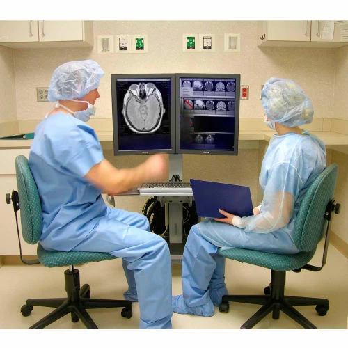Double your view – and move it too! Configure this compact, height-adjustable computer cart to your needs: Flexible open architecture supports a wide range of dual-display configurations and a fleet of accessories. Designed to handle image-intensive applications like radiology and clinical PACS access. A separately ordered Camera Shelf accessory adapts the platform to web conferencing or telemedicine. Features include 20″ (51 cm) height adjustment (work sitting or standing), small footprint and advanced cable management.