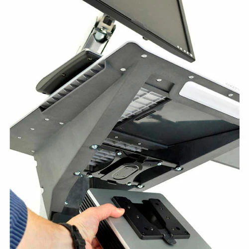 - Power brick can mount under worksurface in cable storage area