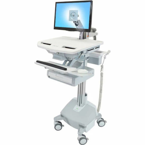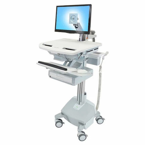 Includes: Auto-locking drawer system (ADS), primary single drawer, drawer dividers, LCD arm, worksurface, CPU lock, secure CPU compartment, four-port USB hub, scanner holder bracket, mouse holder, wrist rest, back-tilt keyboard tray, keyboard lights, left/right mouse tray, rear handle, storage basket, cable storage, four casters (lockable, 1 tracking function), single-battery 40 Ah LiFe power system, 10-foot coiled cord, AC outlets, power system user interface.