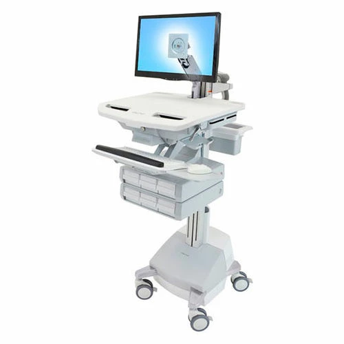 This innovative, truly ergonomic and easy-to-maneuver healthcare cart features sit-to-stand height adjustment, side-to-side LCD and keyboard motion, bi-focal viewing and an adjustable back-tilt keyboard tray. Its auto-locking drawer system enables simple and efficient management of non-controlled medication.