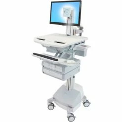 This innovative, truly ergonomic and easy-to-maneuver healthcare cart features sit-to-stand height adjustment, independent screen positioning and an adjustable back-tilt keyboard tray. Its auto-locking drawer system enables simple and efficient management of non-controlled medication.