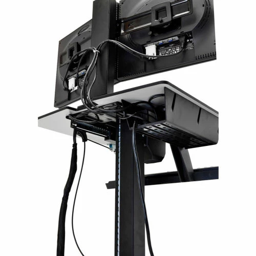 - Includes cart, two (2) LCD mounts, crossbar, integrated worksurface, large stowable keyboard tray, cable storage box, CPU holder, four dual casters (two locking), hand-brake system. Devices shown in the image not included