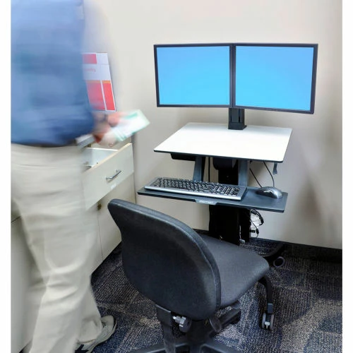 This innovative computer cart doubles as an adjustable standing desk platform. Stay energized and productive while you compute – move from a sitting to a standing position whenever you want. The large worksurface, back-tilt keyboard tray and independently adjustable dual-monitor stand make computing comfortable for prolonged periods.