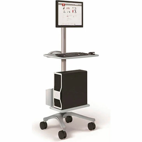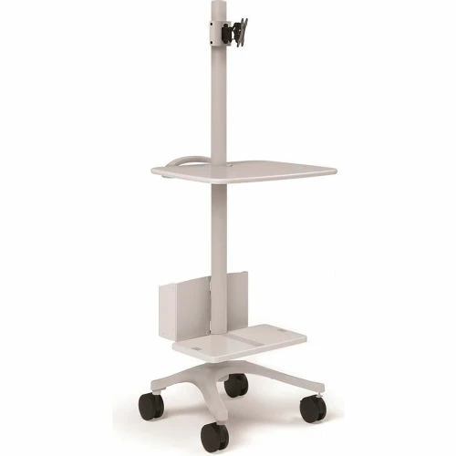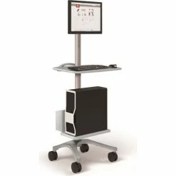 - Includes cable bin, handle, equipment shelf with strap & buckle, monitor pivot, monitor pole, fixed-height cart (column, lipped worksurface, metal base, four 4″ dual-wheel casters)