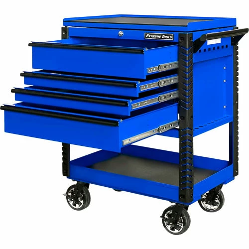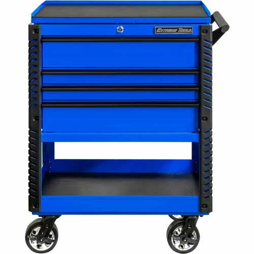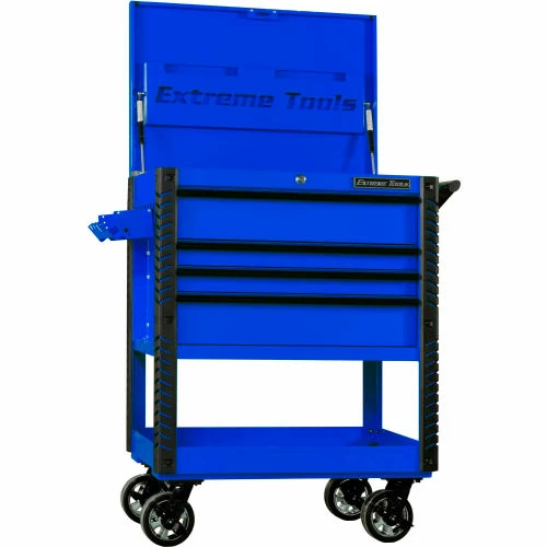 Extreme Tools®EX Professional Series 33″ 4 Drawer Deluxe Tool Cart (patent-pending) can be used as a stand-alone tool cart, or it can be combined with the Extreme Portable Workstation® . The most unique feature of this tool cart is the top storage compartment. Open the lid, and you can access all your tools in the top drawer as well as tool hangers/holders on the sides of the cart. The closed lid securely holds a PVC coated MDF top creating a durable work surface and still allows access to the top drawer. It is the most versatile design you will find. Quick Release self-latching anodized aluminum drawer pulls keep drawers closed until you are ready to open them. Heavy-Duty ball bearing slides on the drawers are load-rated 100 lbs. per drawer. The cart’s corners are covered in tough, impact-resistant non-marking bumpers. Four 6″ x 2″ proprietary Mag Wheel lockable swivel casters allow you to easily move the tool cart in your workspace. As an added bonus, we have included our Power Tool Rack accessory which hangs off the side of the tool cart and keeps your power tools within easy reach.