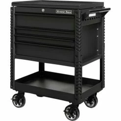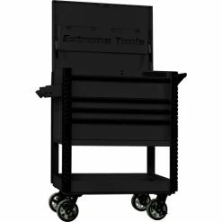 Extreme Tools®EX Professional Series 33″ 4 Drawer Deluxe Tool Cart (patent-pending) can be used as a stand-alone tool cart, or it can be combined with the Extreme Portable Workstation® . The most unique feature of this tool cart is the top storage compartment. Open the lid, and you can access all your tools in the top drawer as well as tool hangers/holders on the sides of the cart. The closed lid securely holds a PVC coated MDF top creating a durable work surface and still allows access to the top drawer. It is the most versatile design you will find. Quick Release self-latching anodized aluminum drawer pulls keep drawers closed until you are ready to open them. Heavy-Duty ball bearing slides on the drawers are load-rated 100 lbs. per drawer. The cart’s corners are covered in tough, impact-resistant non-marking bumpers. Four 6″ x 2″ proprietary Mag Wheel lockable swivel casters allow you to easily move the tool cart in your workspace. As an added bonus, we have included our Power Tool Rack accessory which hangs off the side of the tool cart and keeps your power tools within easy reach.