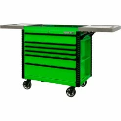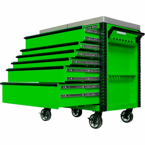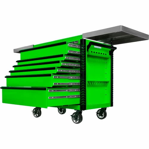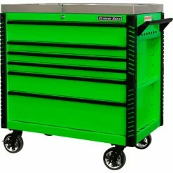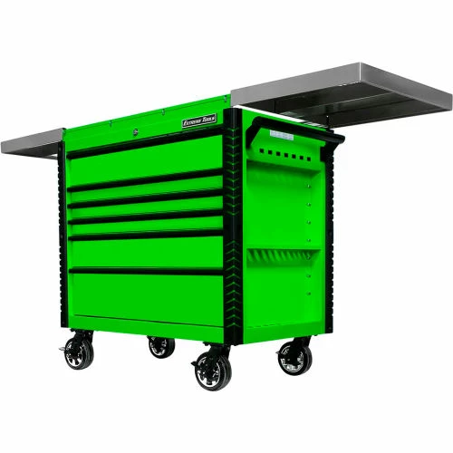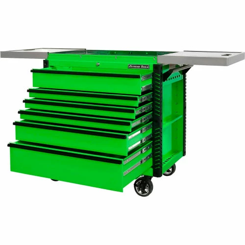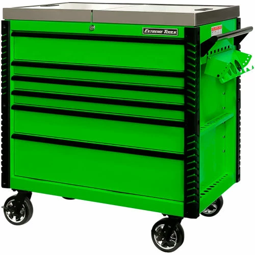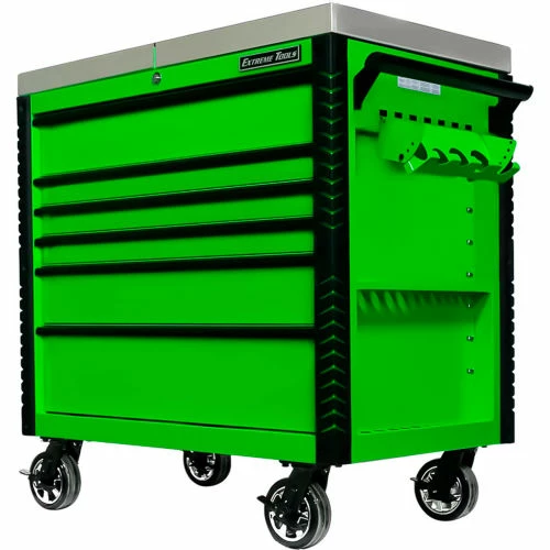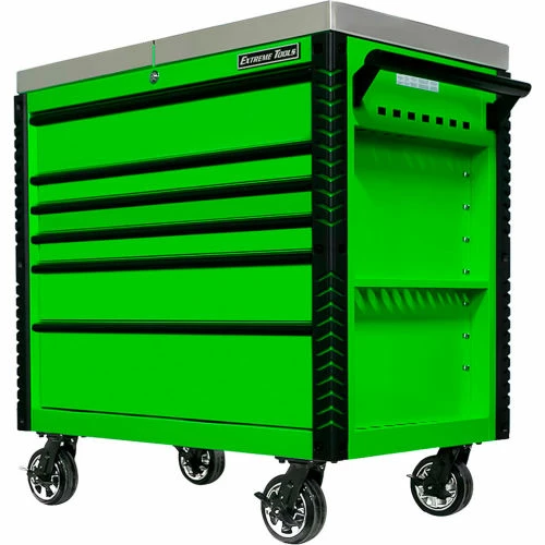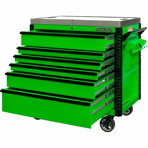 Extreme Tools®EX Professional Series 41″ 6 Drawerstainless Steel Sliding Top Tool Cart combines the convenience of a cart with the storage capacity of a cabinet. The stainless steel top easily slides open to provide access to all your tools in the top drawer as well as the prybar/tool holders on the sides of the cart. The closed lid provides a durable stainless steel work area and still allows access to the top drawer. Patented Quick Release self-latching anodized aluminum drawer pulls keep drawers closed until you are ready to open them. Drawers use Heavy-Duty ball bearing slides load rated 100-200* lbs. per drawer. (*Drawers with double slides.) The cart’s corners are covered in tough, impact-resistant non-marking bumpers. Four 6″ x 2″ proprietary Mag Wheel lockable swivel casters allow you to easily move the tool cart in your workspace. As an added bonus, we have included our Power Tool Rack accessory which hangs off the side of the tool cart and keeps your power tools within easy reach.