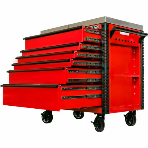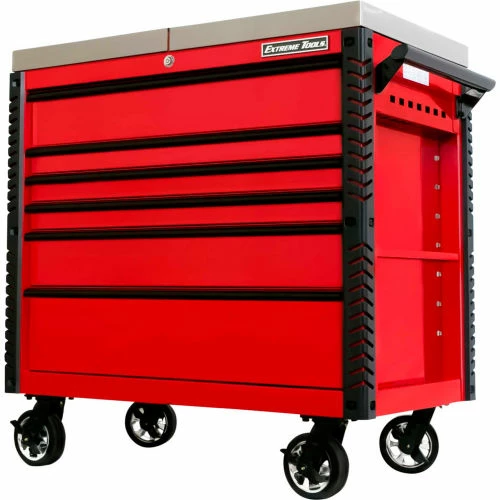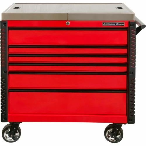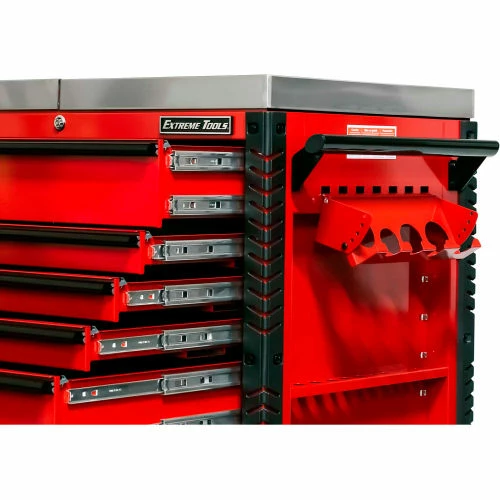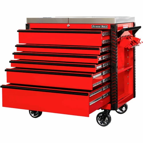 Extreme Tools®EX Professional Series 41″ 6 Drawerstainless Steel Sliding Top Tool Cart combines the convenience of a cart with the storage capacity of a cabinet. The stainless steel top easily slides open to provide access to all your tools in the top drawer as well as the prybar/tool holders on the sides of the cart. The closed lid provides a durable stainless steel work area and still allows access to the top drawer. Patented Quick Release self-latching anodized aluminum drawer pulls keep drawers closed until you are ready to open them. Drawers use Heavy-Duty ball bearing slides load rated 100-200* lbs. per drawer. (*Drawers with double slides.) The cart’s corners are covered in tough, impact-resistant non-marking bumpers. Four 6″ x 2″ proprietary Mag Wheel lockable swivel casters allow you to easily move the tool cart in your workspace. As an added bonus, we have included our Power Tool Rack accessory which hangs off the side of the tool cart and keeps your power tools within easy reach.