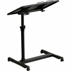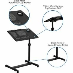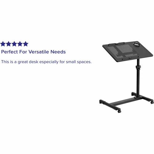 Get moving…or stay put on this mobile computer desk with adjusting capabilities. No need to purchase a cooling pad, the perforated surface allows your laptop to cool down with proper air circulation. Top swivels a full 360 degree, tilts and has a top and bottom lip to prevent papers from falling. The height adjustable frame allow user to adjust the table to their height preference. This computer stand will serve as a great option for arts and crafts.