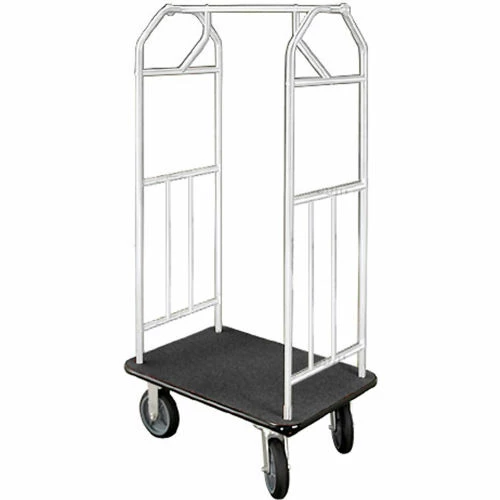Luggage cart is ideal for hotels, condos and apartments; maneuvers easily in elevators. Strong steel chassis and waterproof plywood deck covered in durable black polypropylene closed loop carpet to complement décor and provide years of service. Solid black rubber bumper protects walls. 16 gauge x 1″ diameter tubular uprights endure rough handling and feature a clear-coat satin aluminum finish for minimal maintenance. 71″H. Includes 2 disc hooks for items with straps. Rolls smoothly on 2 swivel and 2 rigid black solid rubber casters. Easy assembly and ships UPS.