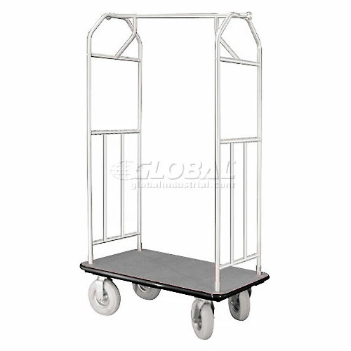 Luggage cart is ideal for hotels, condos and apartments; maneuvers easily in elevators. Strong steel chassis and waterproof plywood deck covered in durable gray polypropylene closed loop carpet to complement décor and provide years of service. Solid black rubber bumper protects walls. 16 gauge x 1″ diameter tubular uprights endure rough handling and feature a clear-coat satin aluminum finish for minimal maintenance. 71″H. Includes 2 disc hooks for items with straps. Rolls smoothly on 2 swivel and 2 rigid gray pneumatic casters. Easy assembly and ships UPS.