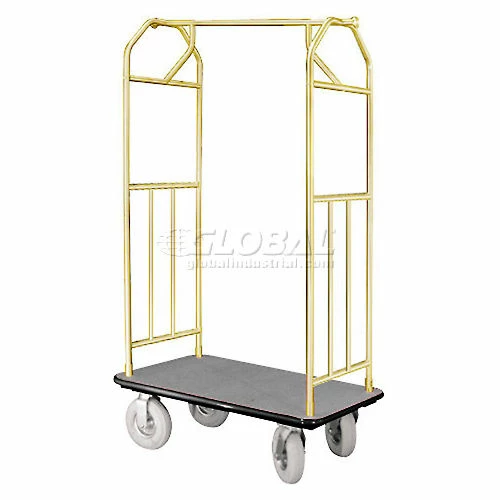 Luggage cart is ideal for hotels, condos and apartments; maneuvers easily in elevators. Strong steel chassis and waterproof plywood deck covered in durable gray polypropylene closed loop carpet to complement décor and provide years of service. Solid black rubber bumper protects walls. 16 gauge x 1″ diameter tubular uprights endure rough handling and feature a tarnish-proof satin brass finish for minimal maintenance. 71″H. Includes 2 disc hooks for items with straps. Rolls smoothly on 2 swivel and 2 rigid gray pneumatic casters. Easy assembly and ships UPS.