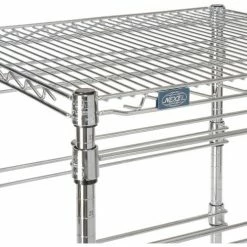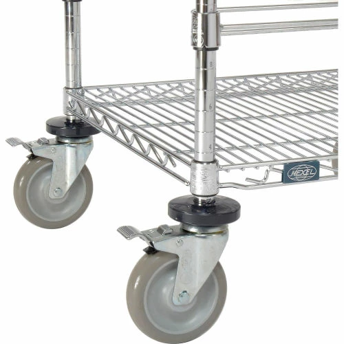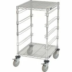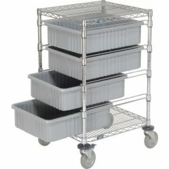 Chrome wire bin carts when combined with dividable grid containers (sold separately) are ideal for storing small to large parts. Bin carts feature adjustable slides for convenient bin access. Easily slide bins in and out for access and storage. Slides are height adjustable at 1″ increments. Chrome wire carts offer an attractive finish that’s suitable for retail environments. Withstands up to 1,200 lb. capacity. Top and bottom chrome wire shelves feature truss perimeter for extra strength and reinforcement while allowing light, air and sprinkler penetration. Open wire design helps reduce dust accumulation. Moves easily on four 5″ polyurethane swivel casters (2 with brakes). Easy assembly. Overall height with casters 40″.