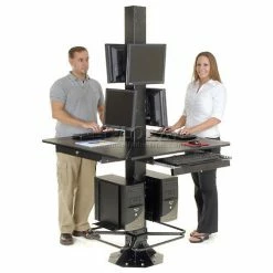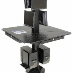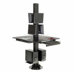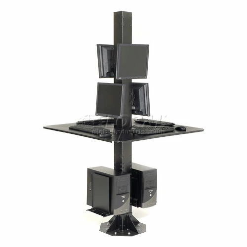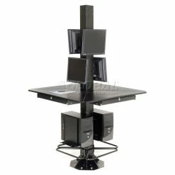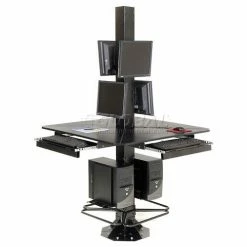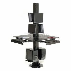 This multi-user workstation is ideal for trade shows, factory floors, retails spaces or anywhere a secure, stable, extremely rugged computer kiosk is needed. Complete unit includes 4 work surfaces, 2 CPU holders, 81″H center post and 2 VESA universal flat panel screen mounts. All steel surfaces include a rugged, attractive powder coat finish. Easy assembly.