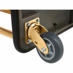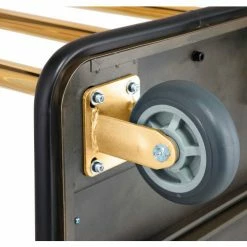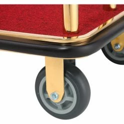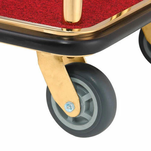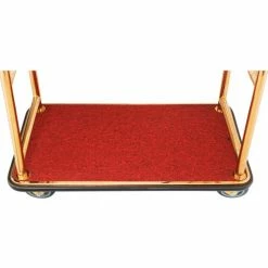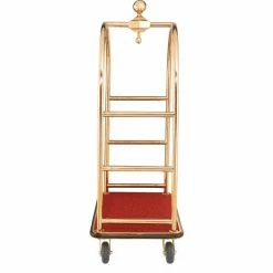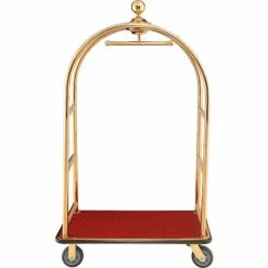 Luggage cart is made using corrosion resistant #201 stainless steel uprights and framing. Heavy duty tubular stainless steel frame is cross braced for added reinforcement. Curved Upright Cart offers a unique 5-star hotel appearance with a ball-tipped design on top. Top of the cart includes a garment bar for hanging wardrobe. Bottom stainless steel deck is covered with a slip resistant carpeted surface to protect luggage and suitcases. Protective deck bumper prevents marring of walls and doorways. Moves easily on 2 swivel, 2 rigid casters. Easy assembly.