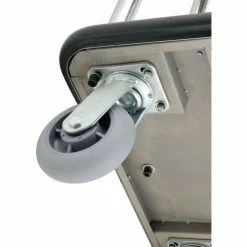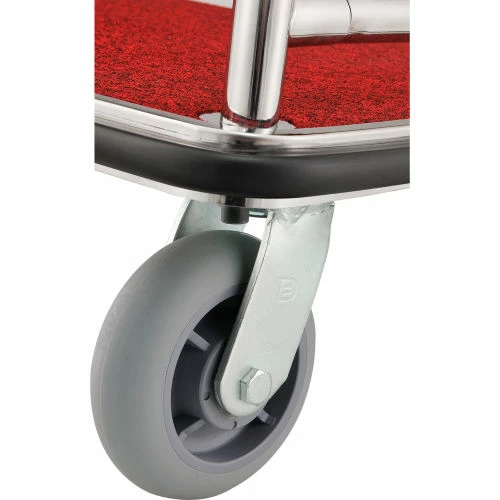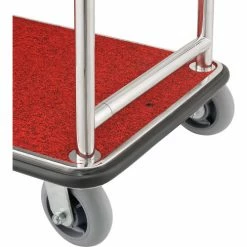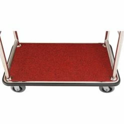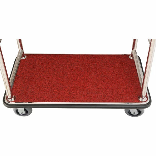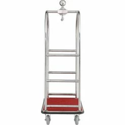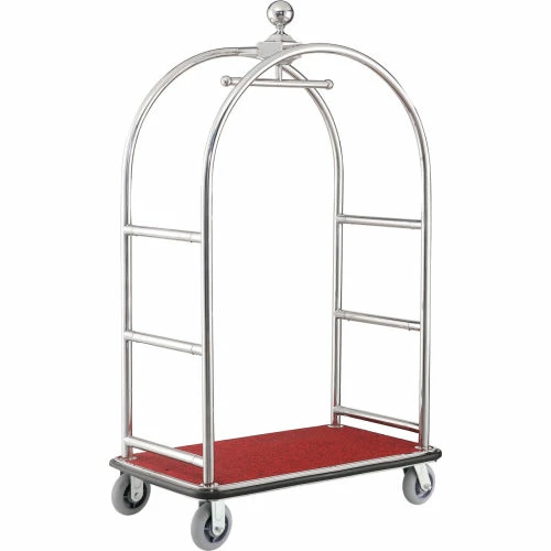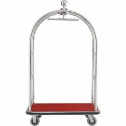 Luggage cart is made using corrosion resistant #201 stainless steel uprights and framing. Heavy duty tubular stainless steel frame is cross braced for added reinforcement. Curved Upright Cart offers a unique 5-star hotel appearance with a ball-tipped design on top. Top of the cart includes a garment bar for hanging wardrobe. Bottom stainless steel deck is covered with a slip resistant carpeted surface to protect luggage and suitcases. Protective deck bumper prevents marring of walls and doorways. Moves easily on 2 swivel, 2 rigid casters. Easy assembly.