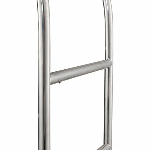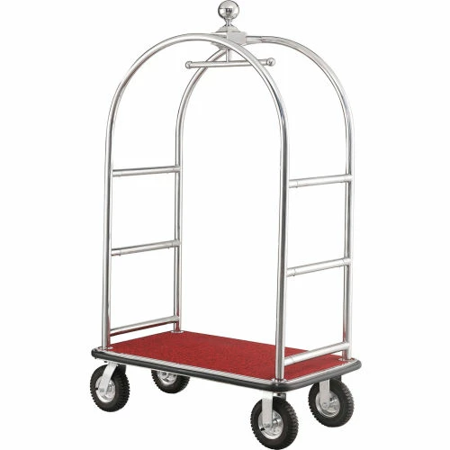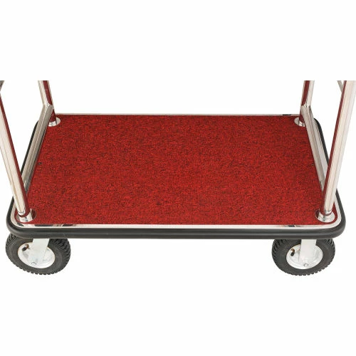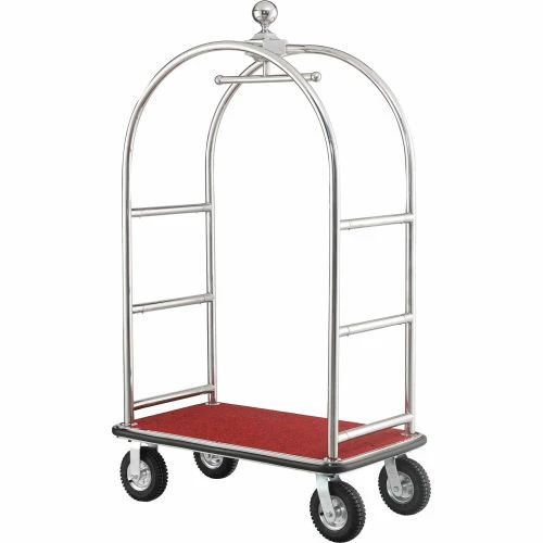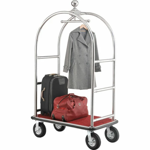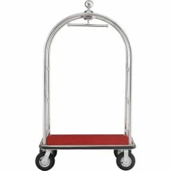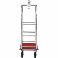 Stainless Steel Luggage cart provides and attractive appearance for hotels while maintaining Strength & Durability. Luggage cart is made using corrosion resistant #201 stainless steel uprights and framing. Heavy duty tubular stainless steel frame is cross braced for added reinforcement. Curved Upright Cart offers a unique 5-star hotel appearance with a ball-tipped design on top. Top of the cart includes a garment bar for hanging wardrobe. Bottom stainless steel deck is covered with a slip resistant carpeted surface to protect luggage and suitcases. Protective deck bumper prevents marring of walls and doorways. Moves easily on 2 swivel, 2 rigid casters. Easy assembly.