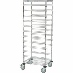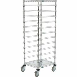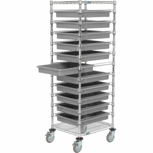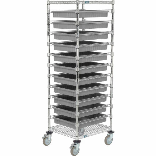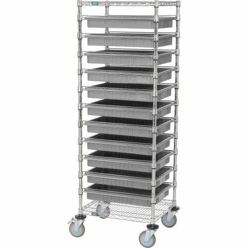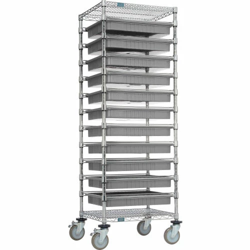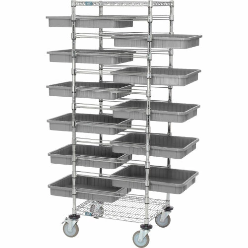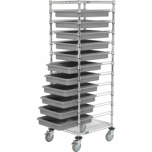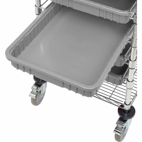 Chrome wire bin carts combined with dividable grid containers are ideal for storing small to large parts. Bin carts feature adjustable slides for convenient bin access. Easily slide bins in and out for access and storage. Slides are height adjustable at 1″ increments. Dividable containers allow multiple configurations within each bin. Heavy duty grid containers are great for storage, assembly, fabrication and distribution applications. Chrome wire carts offer an attractive finish that’s suitable for retail environments. Withstands up to 1,200 lb. capacity. Top and bottom chrome wire shelves feature truss perimeter for extra strength and reinforcement while allowing light, air and sprinkler penetration. Open wire design helps reduce dust accumulation. Divider box containers are made of high-density FDA approved polyethylene. Ribbed external sides provide strength and withstand impacts. Divider boxes are injection molded and resist most solvents and chemicals. Moves easily on four 5″ polyurethane swivel casters (2 with brakes). Easy assembly.