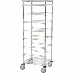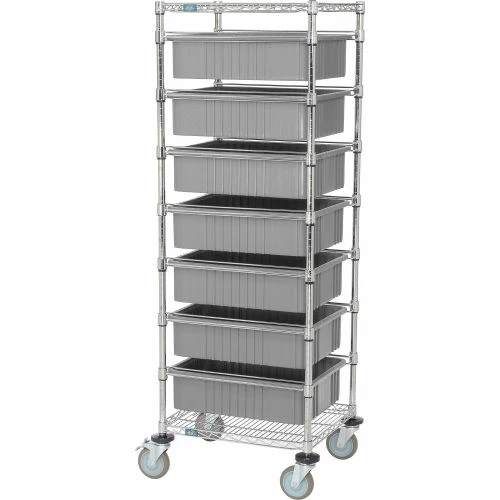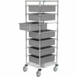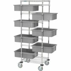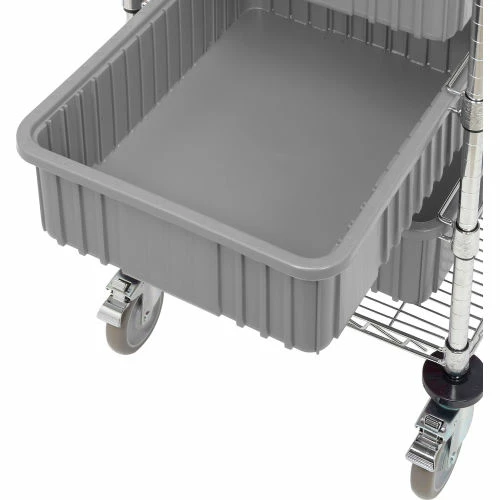 Chrome wire bin carts combined with dividable grid containers are ideal for storing small to large parts. Bin carts feature adjustable slides for convenient bin access. Easily slide bins in and out for access and storage. Slides are height adjustable at 1″ increments. Dividable containers allow multiple configurations within each bin. Heavy duty grid containers are great for storage, assembly, fabrication and distribution applications. Chrome wire carts offer an attractive finish that’s suitable for retail environments. Withstands up to 1,200 lb. capacity. Top and bottom chrome wire shelves feature truss perimeter for extra strength and reinforcement while allowing light, air and sprinkler penetration. Open wire design helps reduce dust accumulation. Divider box containers are made of high-density FDA approved polyethylene. Ribbed external sides provide strength and withstand impacts. Divider boxes are injection molded and resist most solvents and chemicals. Moves easily on four 5″ polyurethane swivel casters (2 with brakes). Easy assembly.
