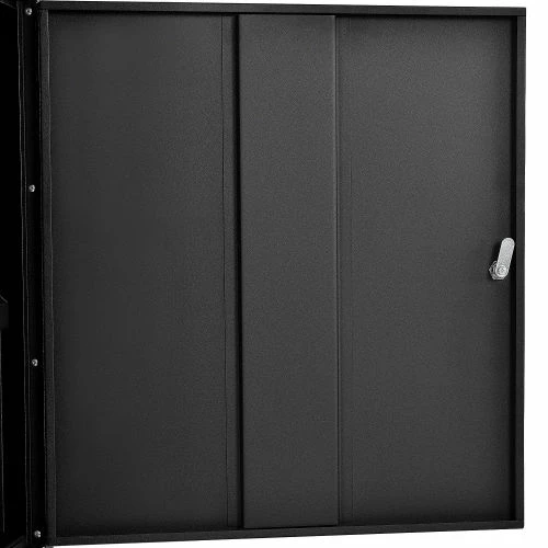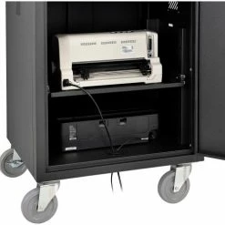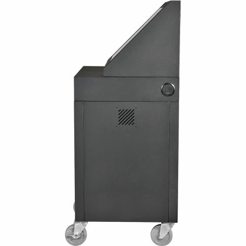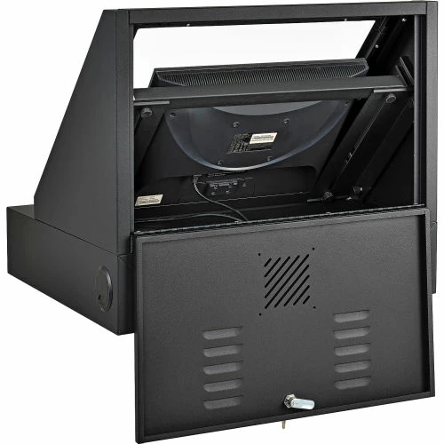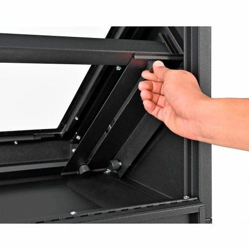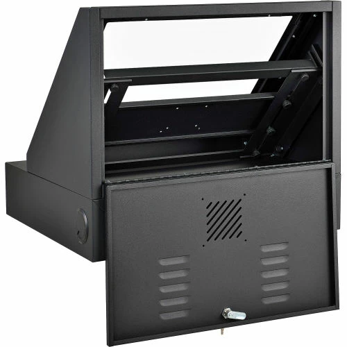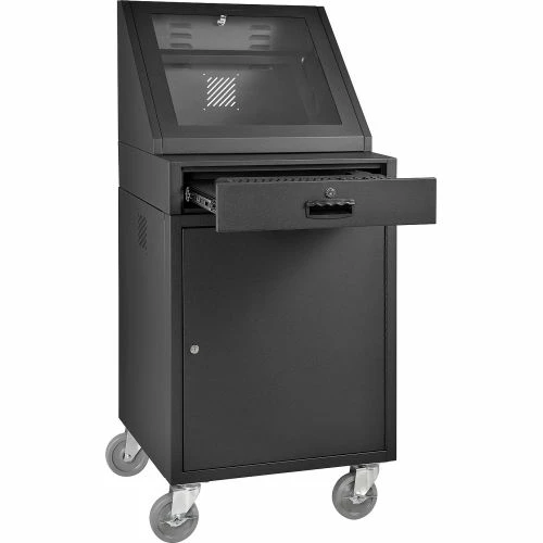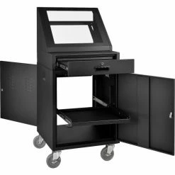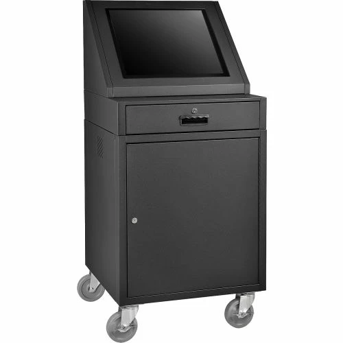 Designed for optimum, ergonomic viewing that helps increase productivity. Convenient sloped display helps reduce neck strain for comfort and glare for clear monitor viewing. Includes 2 types of monitor mounts to hold LCD monitors up to 21″ diagonal. Includes a VESA mount monitor bracket and adjustable channel formed arms that support the monitor frame. The locking monitor compartment includes a break-resistant 18-1/2″W x 16-1/2″H acrylic window framed in heavy-duty steel. Window panel is removable which gives easy access to Touch Screen Monitors. Includes a 6-1/2″ ledge for additional work surface. Locking keyboard drawer and height adjustable printer shelf extends fully on steel ball bearing suspensions. Lower compartment has front and rear doors. Cable management openings throughout. All locks are keyed alike for dependable security that limits access to components and prevents theft and vandalism. Rear panels are louvered to regulate heat. Moves on 5″ diameter swivel casters (2 locking). Black Powder coat finish. Optional Fan with 5’L power cord reduces heat build up. Order one fan for each upper, lower and side car cabinet. Upper frame consists of: 24 gauge panels, 19 gauge sliding keyboard/mouse tray. Lower frame consists of: 23 gauge door & door frame, 23 gauge side & bottom panels, 20 gauge drawer thickness. Optional Accessories side shelves, CPU side car cabinet, fan and sliding mouse tray sold separately. Easy Assembly.