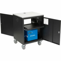 Need to power a wide range of audio visual equipment and keep it on-the-go within your facility? The Global Industrial Mobile Powered Audio Visual Cart is perfect for powering and rolling your monitors, projectors, and other AV equipment. This battery powered AV cart includes a single 40AH battery that offers 500W continuous output power for 6-8 hours, making it ideal for powering audio visual equipment in industrial rooms, classrooms, and warehouse facilities. Both front and rear doors have a keyed-alike lock to ensure extra cargo protection. A punch-out on the rear door includes an easy-to-install 4-1/2″ diameter fan with 5-blade propeller to easily ventilate any connected electronic equipment and components. The fan easily installs in knock-outs and ventilation openings using the included hardware for optimum exhaust applications. Cart includes a height-adjustable slide-out shelf. The gray laminated work surface and base have convenient ports for simple cord and wire management. Built-in cord wrap and side carrying handles. Rolls easily on 4 rubber swivel casters (2 with brakes). 1-Year Limited Warranty.