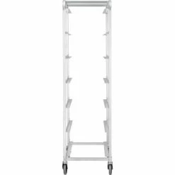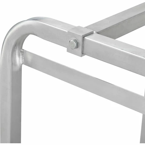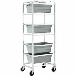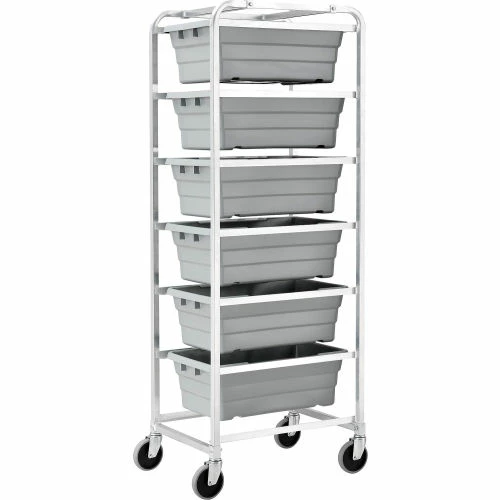 Tote box carts make transporting bin totes easy! These tote lug carts are designed for transporting and storing anything from small parts, components to food and recyclables. Durable tote carts roll smoothly on casters. Slide runners support tote boxes and allow quick, easy access. These tote carts accept plastic tote boxes that measure 25-1/8″”L x 16″”W x 8-1/2″”H (totes sold separately). Made with lightweight, tubular aluminum framing. Moves easily on 5″x1 stem caster with gray TPR wheel. NSF listing.