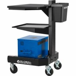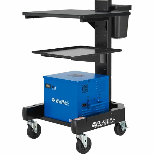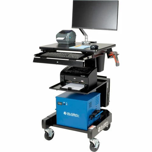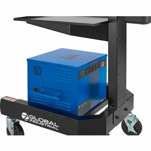The Global Industrial™ Orbit Mobile Powered Cart with 100AH Battery is ideal for warehouses, manufacturing facilities, and industrial environments where employees are on the move between multiple areas. Portable battery powers a laptop, small thermal printer and scanner for 8+ hours. It features a solid steel post and base to provide deft support along with a smooth black laminate work surface. The ample work surface is thick and easily mounts at various heights. Durable center post includes built-in cable management openings. Cart moves easily on caster base. Base features a wide shelf and 4″ rubber casters (2 locking). Black powder coat finish. Easy assembly.