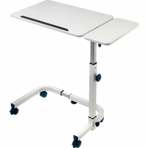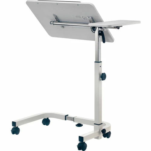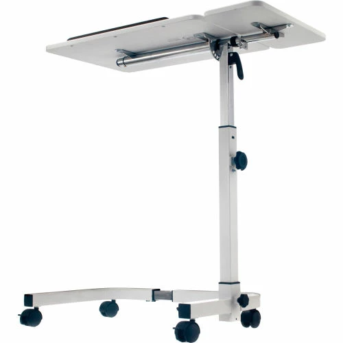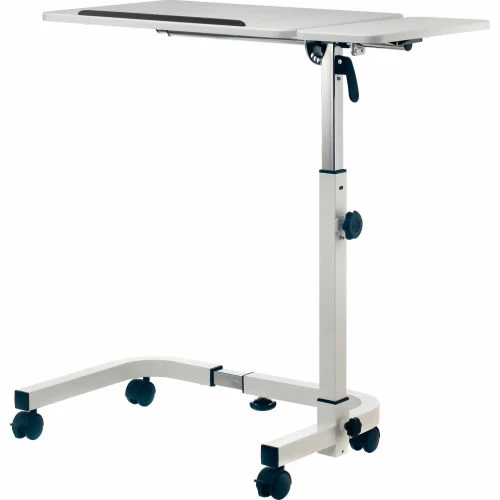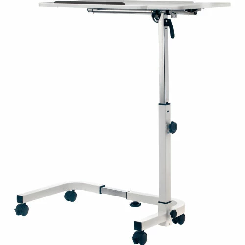 The Global Industrial™ Tilting Adjustable Height Mobile Laptop Desk is ideal for offices, schools, hospitals, medical clinics, conference rooms or homes. The large main desktop that tilts by adjusting the control knob for maximum ergonomic comfort while working, reading or writing. The 36″ white desktop is sturdy and height-adjustable for sitting or standing position. Adjust the height of the top from 27.4″ to 40″ high and secure with a simple twist-lock knob. The frame is constructed with tubular steel and durable, attractive white powder coated finish. 2″ swivel casters (2 locking) allow for easy maneuverability. Easy assembly. 1 Year Limited Warranty.