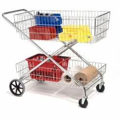 Rugged 1” round tubular steel frame. Extra large heavy duty welded steel baskets transport bulky items easily. 36” x 16” x 11”H upper basket. Removable 35″ x 15-3/4” x 7”H lower basket. File rails included to accommodate hanging files. Two 4” swivel rubber wheel casters in front. Two rigid semi-pneumatic wheels in back for easy mobility. This product does not fold.
