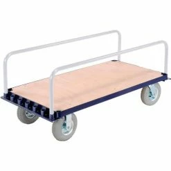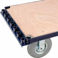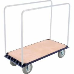 Upright 1-3/16″ dia. pipe frames are available in three different heights to allow easy access of cargo, while keeping materials upright. Uprights adjust on 3-1/2″ increments. (Upright frames sold separately.) 7 available socket positions. Truck platform is constructed of strong angle iron frame with rounded safety edges finished in scratch resistant blue enamel. Rugged 3/4″ thick plywood deck has a durable lacquer finish. Rolls smoothly on 2 swivel, 2 rigid casters. Assembles easily.