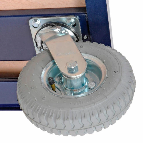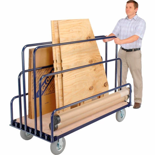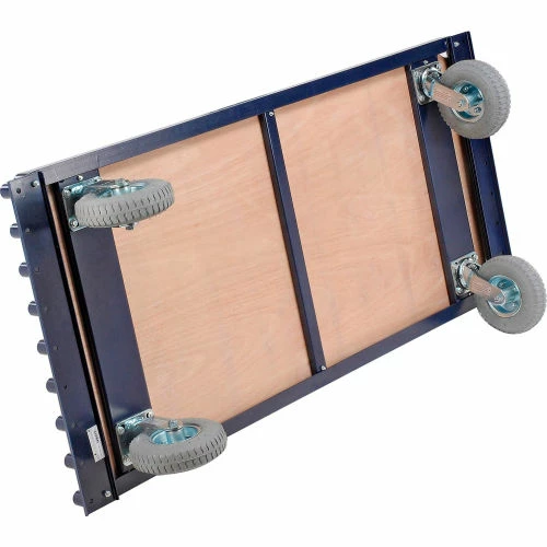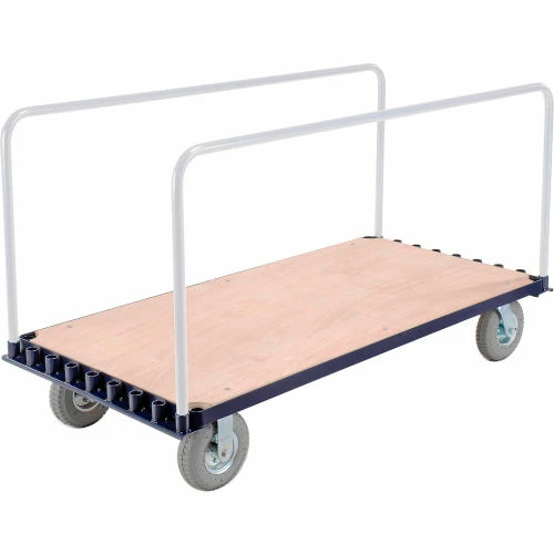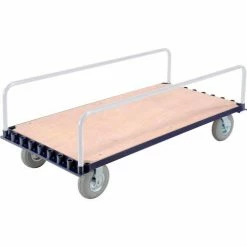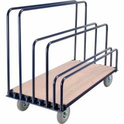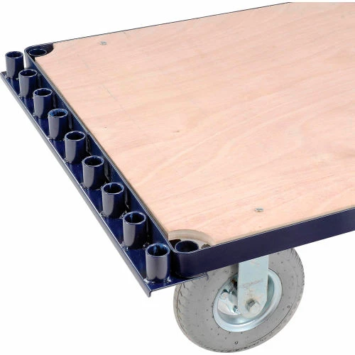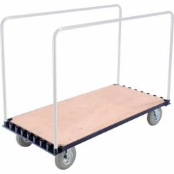Upright 1-3/16″ dia. pipe frames are available in three different heights to allow easy access of cargo, while keeping materials upright. Uprights adjust on 3-1/2″ increments. (Upright frames sold separately.) 9 available socket positions. Truck platform is constructed of strong angle iron frame with rounded safety edges finished in scratch resistant blue enamel. Rugged 3/4″ thick plywood deck has a durable lacquer finish. Rolls smoothly on 2 swivel, 2 rigid casters. Assembles easily.