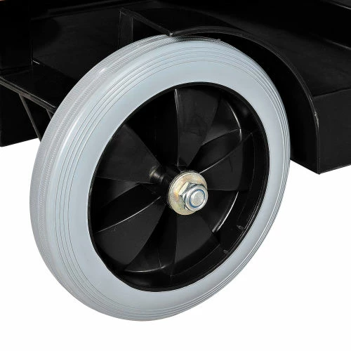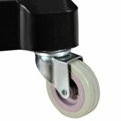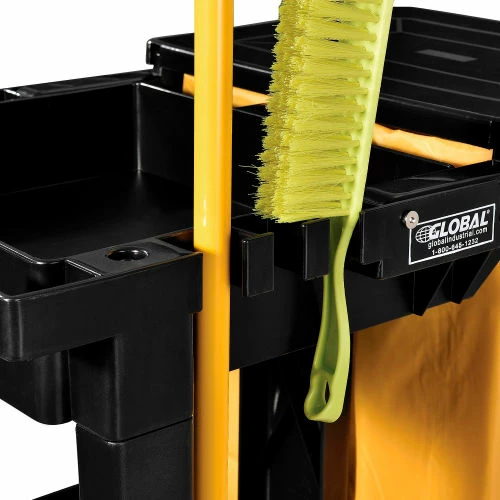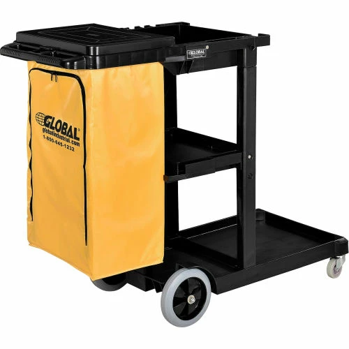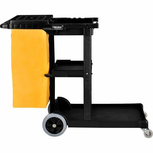 This high-density plastic janitorial cart holds everything, is easy-to-clean and withstands constant heavy use. With 3 sturdy shelves, mop and broom holders and a front platform that holds a 20 gallon waste can or most mop buckets, this janitorial cart is fully featured to save time and effort. Rugged 25 gallon zippered vinyl bag permits easy emptying and attaches securely to cart; Hinged Lid covers vinyl bag to hide waste or laundry collection. Molded-in grip handle and large 8″ rear wheels and 3″ front swivel casters allow easy maneuverability, even in tight areas. Cart measures 48-1/2″L x 20″W x 39″H. Shelf dimensions – Bottom 32″ x 18″ x 2″, Middle 12-1/2″ x 15″ x 2″, Top 12-1/2″ x 15″ x 3″. Wringer bucket and supplies sold separately. Requires assembly
