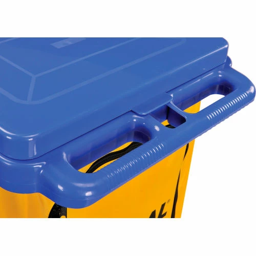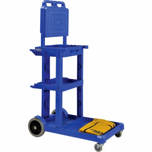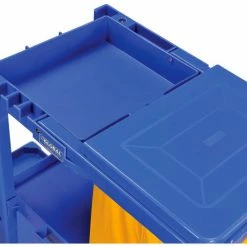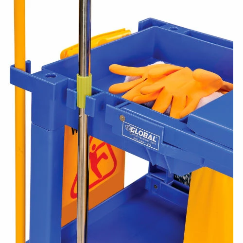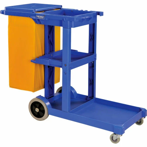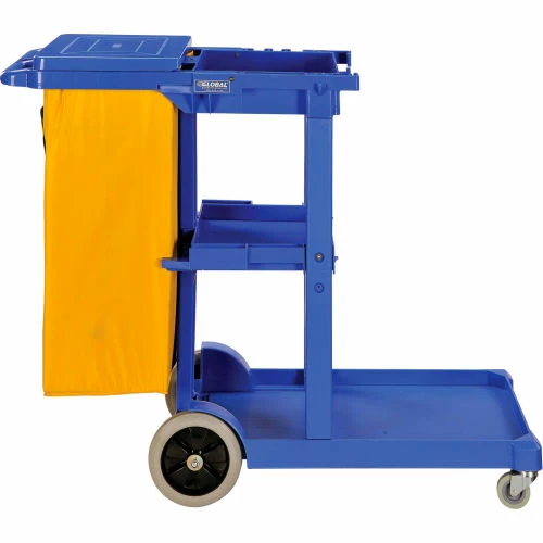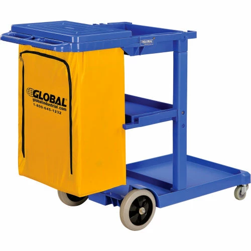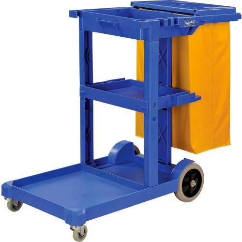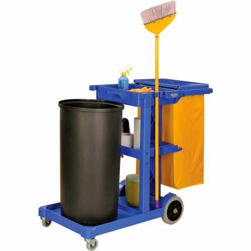 This high-density plastic janitorial cart holds everything, is easy-to-clean and withstands constant heavy use. With 3 sturdy shelves, mop and broom holders and a front platform that holds a 20 gallon waste can or most mop buckets, this janitorial cart is fully featured to save time and effort. Rugged 25 gallon zippered vinyl bag permits easy emptying and attaches securely to cart; Hinged Lid covers vinyl bag to hide waste or laundry collection. Molded-in grip handle and large 8″ rear wheels and 3″ front swivel casters allow easy maneuverability, even in tight areas. Cart measures 48-1/2″L x 20″W x 39″H. Shelf dimensions – Bottom 32″ x 18″ x 2″, Middle 12-1/2″ x 15″ x 2″, Top 12-1/2″ x 15″ x 3″. Wringer bucket and supplies sold separately.