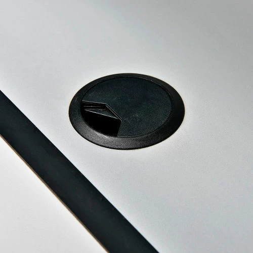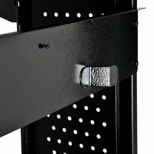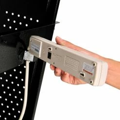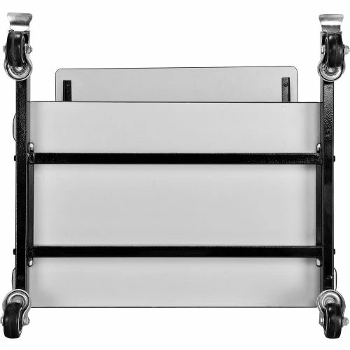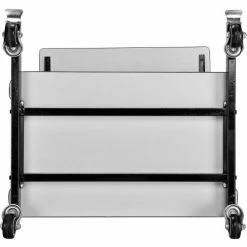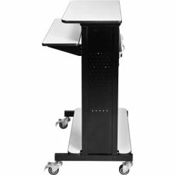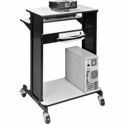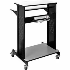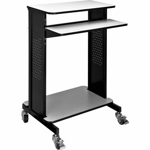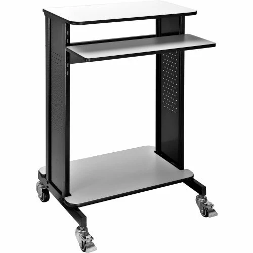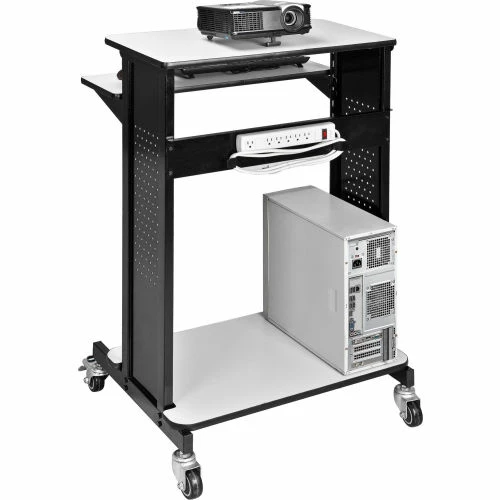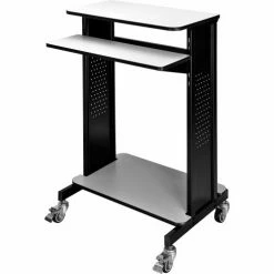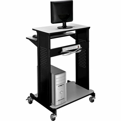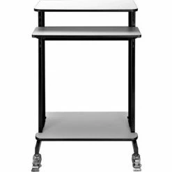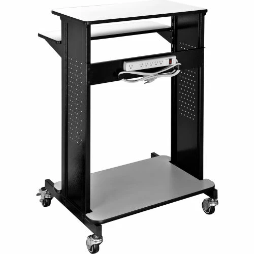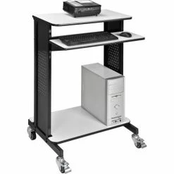 This extra-tall 46″H workstation is designed for standing applications. Top work surface 28-3/4″W x 16″D supports your PC with room for supplies. Keyboard shelf is set at 36″H. Adjustable lower shelf measures 28-1/4″W x 18″D and holds supplies, a mini-tower CPU or printer. Four 1″ swivel casters (2 locking). Sturdy black coated steel frame with 3/4″ light gray laminate surfaces. Easy assembly. Optional 6-outlet power strip (model# 500881) is sold separately.