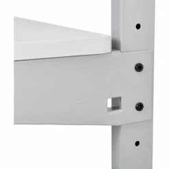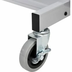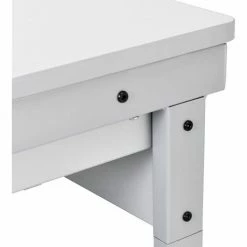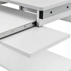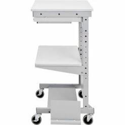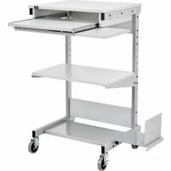 This mobile computer workstation allows you to work comfortably standing up. Tubular steel frame is reinforced by 2 panels for added stability. Gray laminate top work surface and keyboard shelf are moisture and scratch resistant. Top work surface and printer shelf adjust at 2″ increments. Roll-out keyboard shelf adjusts 40″ to 46″ height. Mouse shelf stores away under the keyboard shelf. The steel bottom storage shelf is fixed. 4″ non-marring casters (2 locking) make for easy maneuverability. Easy assembly.