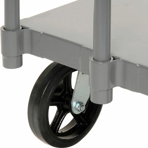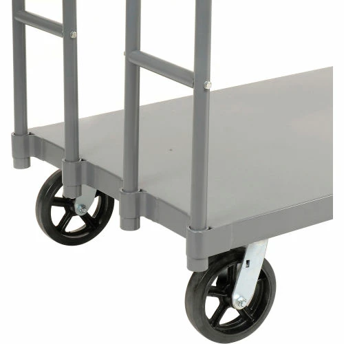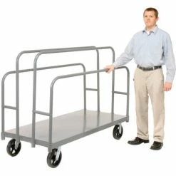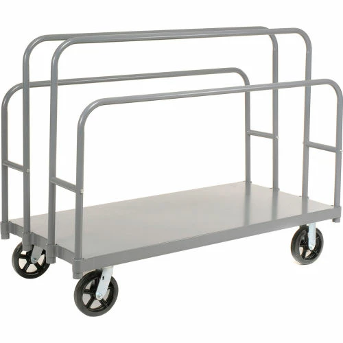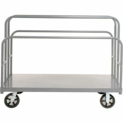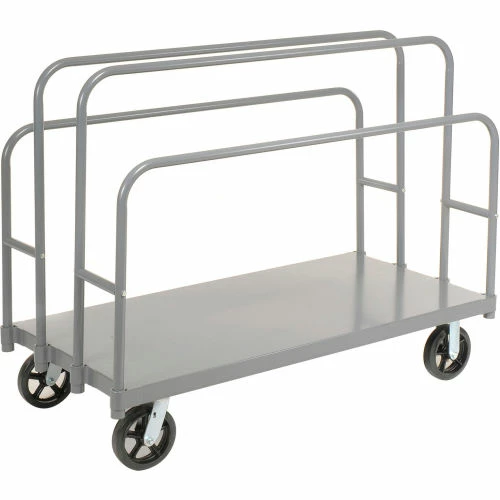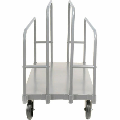 Transport plywood, drywall, lumber, pipe and other long, bulky products with ease. Removable 1-3/16″ diameter steel pipe uprights are 24″ and 34″ high and offer (2) 7″W and (1) 10″W bays to help keep the oversized cargo stable. Strong 60″L x 30″W 14-gauge channel reinforced steel deck with welded upright sockets for maximum durability. Rolls easily on 2 swivel, 2 rigid casters. 11-1/2″ height. Scratch resistant enamel finish. Assembles easily.