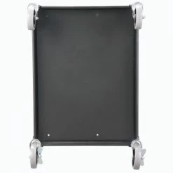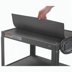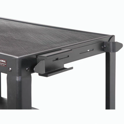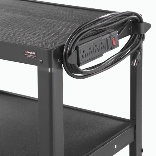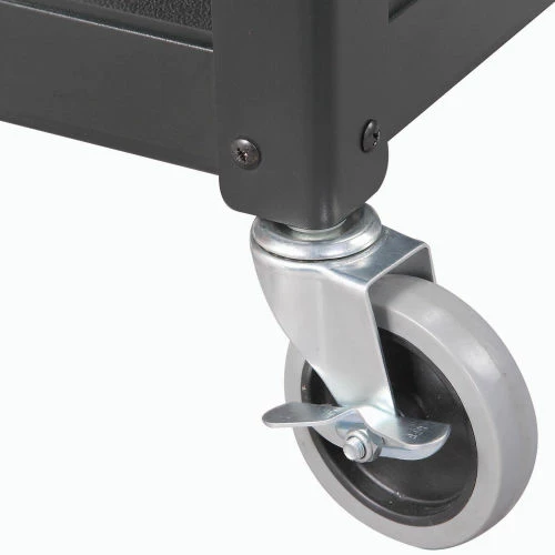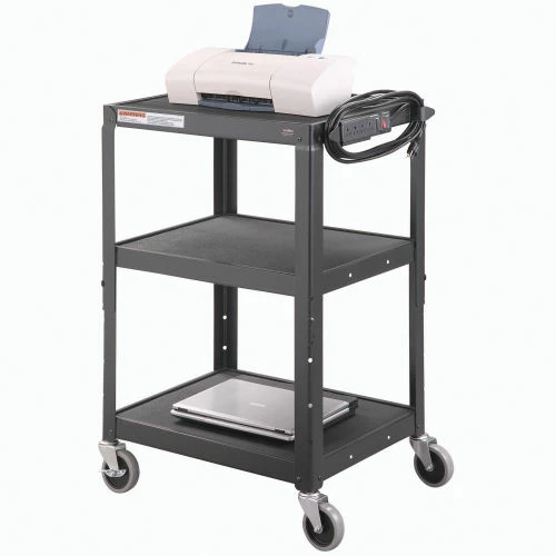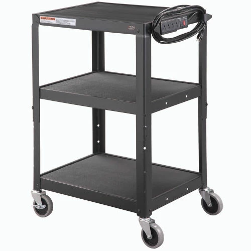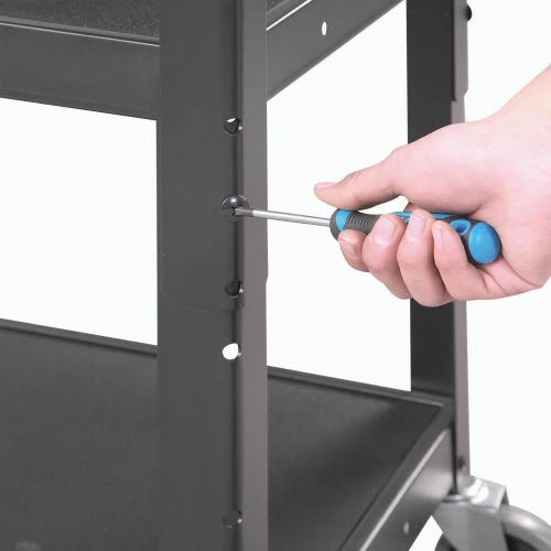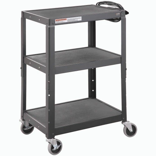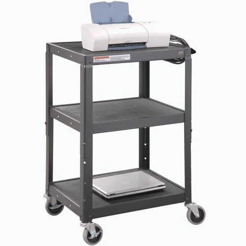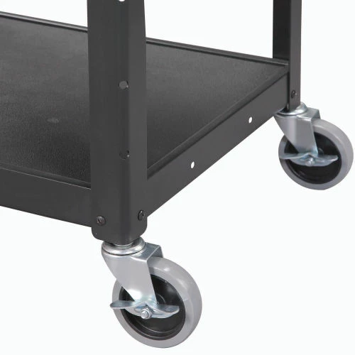 Safely transport and store electronics, audio visual supplies, and other valuable equipment with the Global Industrial™ Steel Audio Visual & Instrument Cart. This media cart has sturdy shelves that adjust in 4″ increments with a 1/2″ lip that helps easily retains cargo. Maximum Shelf Space Between The Middle And Top Shelf Is 16″; The Distance Between The Leg On The Upper Section Is 14.9″ And 14.6″ On The Lower Section. Its top shelf is lined with a non-slip vinyl mat so items stay in place while ball bearings rubber casters help it roll smoothly across most surfaces. 5-Year Limited Warranty.