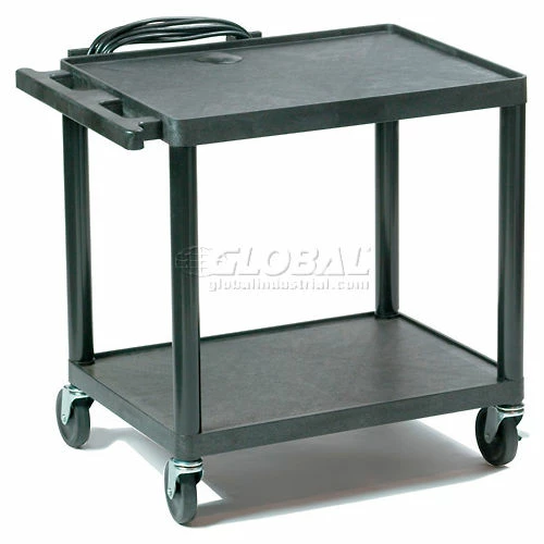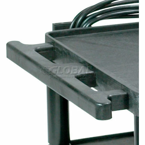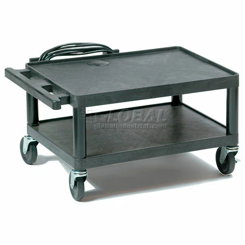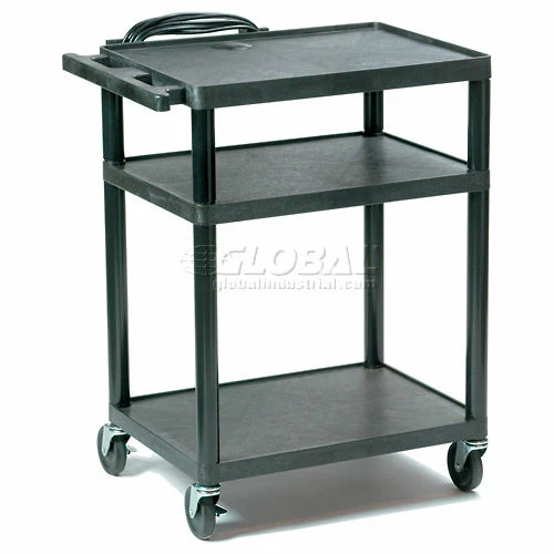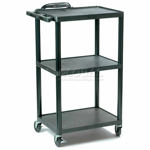 This AV cart is built to last, featuring a durable polyethylene construction with reinforced ribbing under the shelves for extra strength to support 300lb overall capacity. Audio visual cart can be configured at 16″, 26″, 34″ or 42″ heights for added flexibility. Top shelf includes a ½” lip surround to help retain cargo. Media cart features an integrated 3-outlet power strip with 15′ cord for powering equipment, and a cord wrap is included to keep the power cord neatly stored. Rolls easily on 4″ non-marring rubber casters (2 with brakes). Assembles easily. Limited Lifetime Warranty.