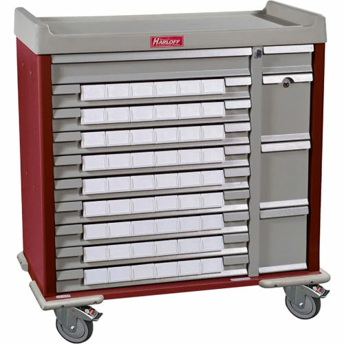 Standard Med-Bin Cart with BEST® Lock, 54 3-1/2″W bins, pull-out shelf, bin dividers and labels. Bins extend 8-1/2″ D into the drawer and have a small tab that fits under a metal edge. There is 7″ of open space behind the bins. Corner bumpers, protecting the cart. 5- ball-bearing premium rubber casters, full swivel, 2 with toe locking brake and 1 directional for easy maneuverability.