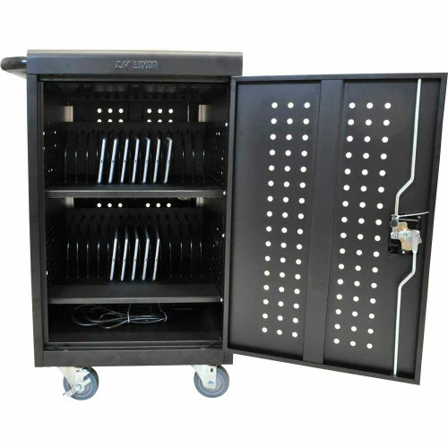 Luxor Tablet / Chromebook Charging Carts safely charge, store and transport tablets and Chromebooks to meet the evolving IT needs of classrooms and dynamic work environments. A strong, simple design with lockable steel doors provides rugged security and storage while inside, an electrical assembly and cord management system keep things organized and charged up. Rubber-coated dividers won’t scratch devices and help provide impact protection during transit, which is made easy even when fully loaded thanks to rolling casters and a full-length handle. And the cabinet requires minimal assembly – simply attach the casters and handle.