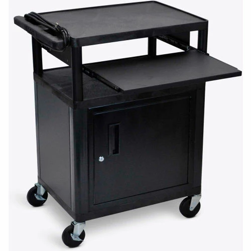Security Cart with Pull-Out Laptop Shelf features a 19-½” W x 16″ D retractable shelf that is perfect for use with laptop or notebook computers, and a lockable 16″H steel storage compartment to protect valuables. Cabinet lock includes two keys.