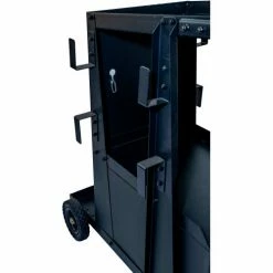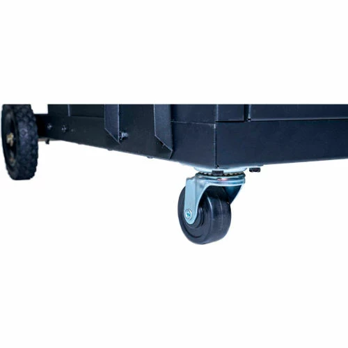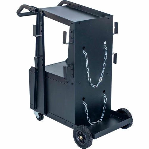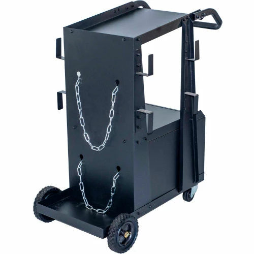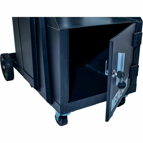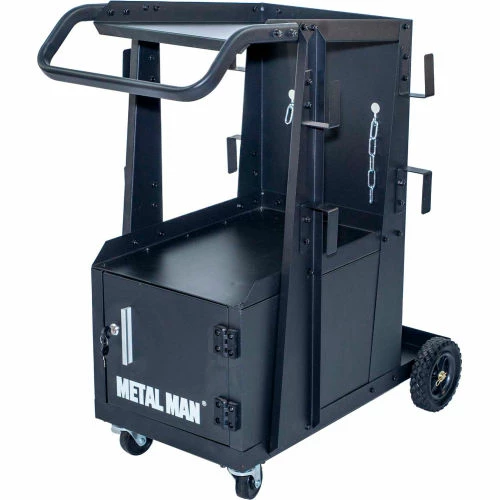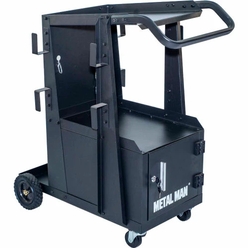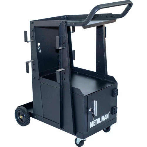 The Metal Man Three-Tier Welding Cabinet is a great way to organize your welding tools. The top shelf has ample space for most brands of welders. The shelf is 34″ off the floor putting your welder at a good working height. The slight backwards slope gives the operator easy view of the welder controls. A reversible tow handle allows you to position it best for your welder. The tall second shelf is well positioned for a second welding tool. This cart allows you to store both welders on one cart. The lockable cabinet at the bottom of the cart gives you secure storage for your welding helmet and other welding accessories.
