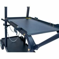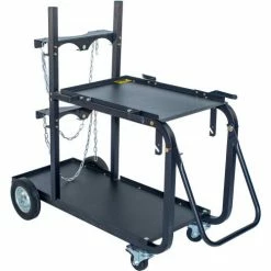 The Metal Man Heavy Duty Single/Dual Bottle Welding Cart is designed for multiple uses. It can be used to hold portable wire welders, plasma cutters and TIG welders along with the bottle of shielding gas needed for that application. Its unique cylinder rack allows you to configure it to carry one bottle of gas up to 10″ in diameter and up to 300 cu. Ft.; or two separate bottles of gas up to 7-1/2″ in diameter or 150 cu. Ft. each. This cart can be used to hold two separate welders, or a welder and a plasma cutter. This cart can also be used as a power source and feeder cart. The bottom shelf has an 18″ clearance, giving ample space to store a smaller, inverter-based welding power source on the bottom shelf. The top shelf has ample space to fit a wire feeder. In addition, the top of the cylinder securement rack can be removed to accommodate the wire feeder spool holder and a large spool of wire.