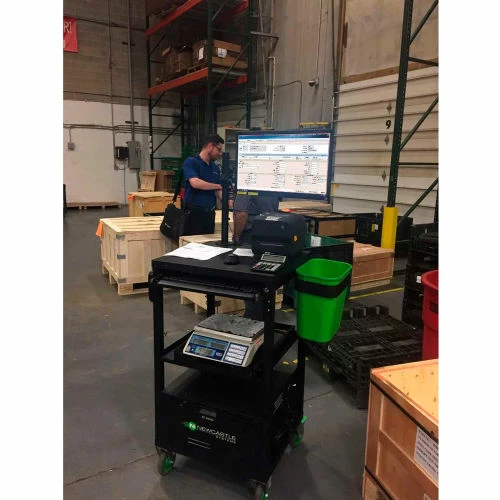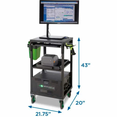 Boost convenience and mobility in your workplace with the Newcastle Systems EC Series EcoCart Mobile Powered Laptop Cart. This entry-level EcoCart mobile powered workstation is designed to expedite productivity while eliminating unnecessary movement, touches, and transportation wastes. Ideal for large shipping warehouses, this unit can help improve dock to stock cycle times in receiving and on-time shipments. Suitably made for powering a laptop, barcode printer, and scanner for 8+ hours at a time. At the end of use, simply plug your cart into a standard wall outlet to recharge. This mobile powered cart cannot charge and use at the same time.