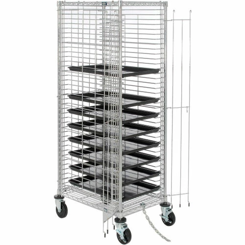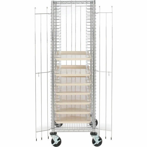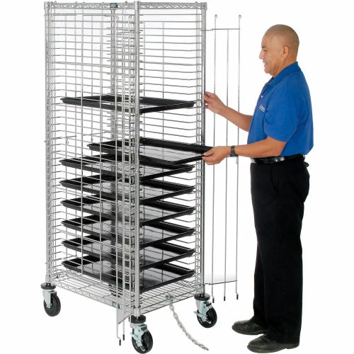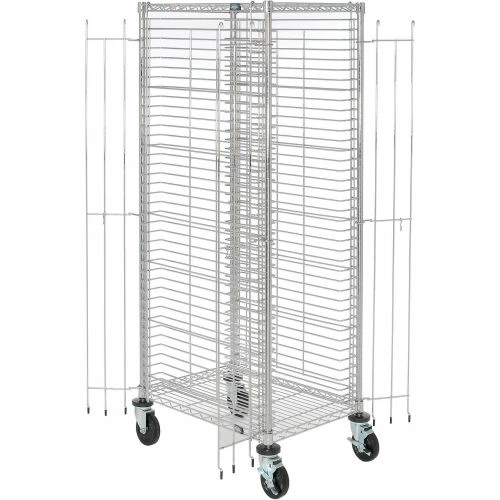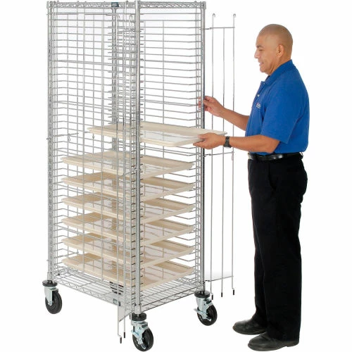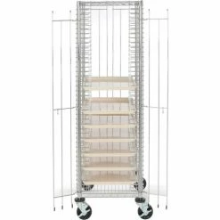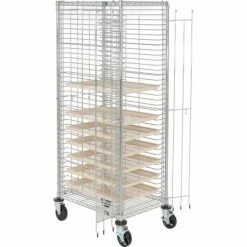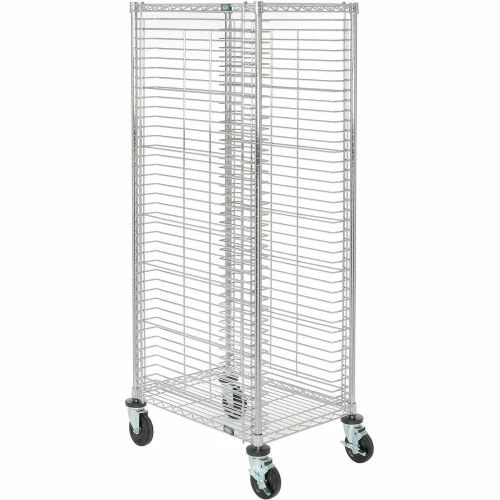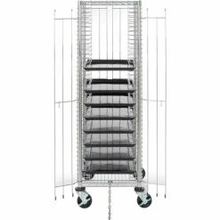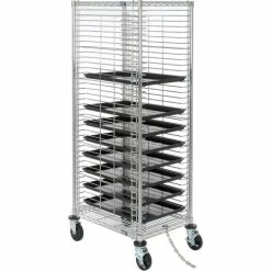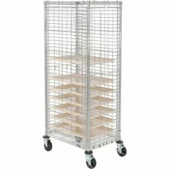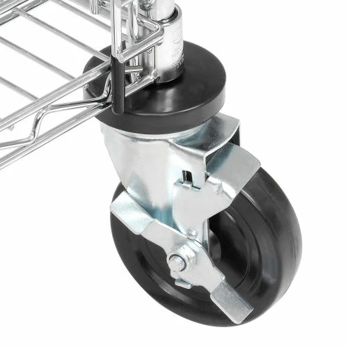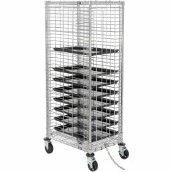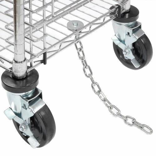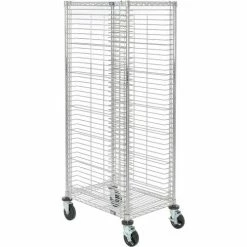 Open chrome-plated wire construction permits easy access and removal of contents. Allows maximum air circulation while minimizing dust accumulation. Rolls easily on 5″ x 1-1/4″ rubber swivel casters, 2 with brakes. Rubber bumpers help to protect walls. 1-1/2″ spacing between shelves.